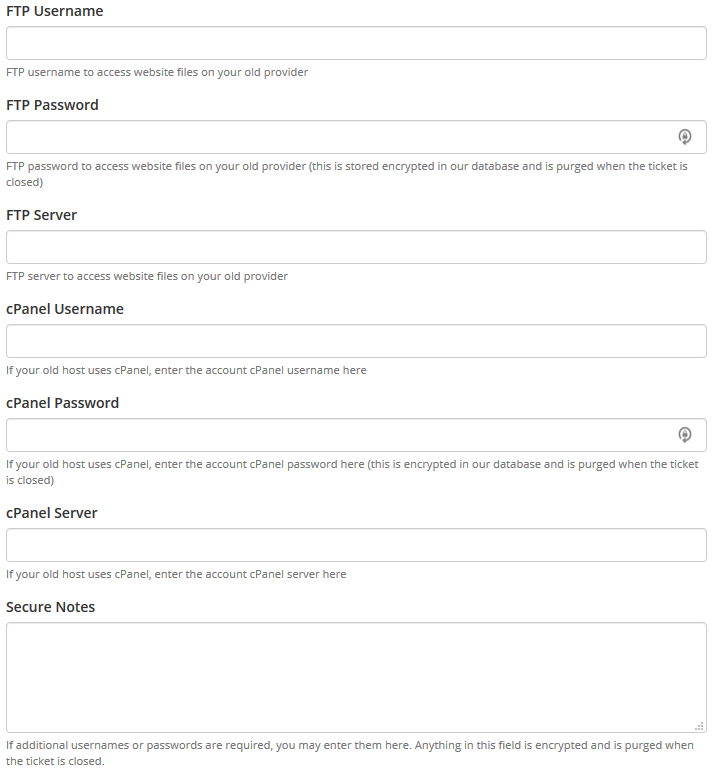 You will need to open a Site Transfer Ticket and be sure to complete as much of the information as possible that is requested in the custom fields such as FTP username and password, cPanel username and password, and any other information we need. You can use the Secure Notes section to leave us additional details such as other usernames, passwords, and server connection requirements. All these fields are encrypted in our database and once your Site Transfer Ticket is closed, the data is automatically purged from our system. We do not store sensitive information longer than we need to.