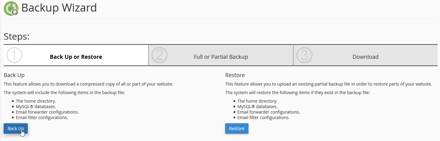 If you found the Backup Wizard icon, click on it. It'll take you to a screen that looks similar to the image below. Click on the Backup button to generate a full backup of your hosting account.
