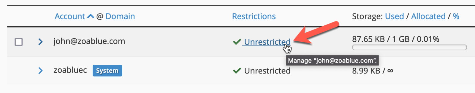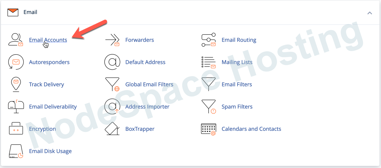 You may want to restrict an email account for certain reasons. For example, an employee has left your company or you need to restrict an email temporarily without deleting it. Login to cPanel, either directly or from My NodeSpace. Locate the Email section and click on Email Accounts.