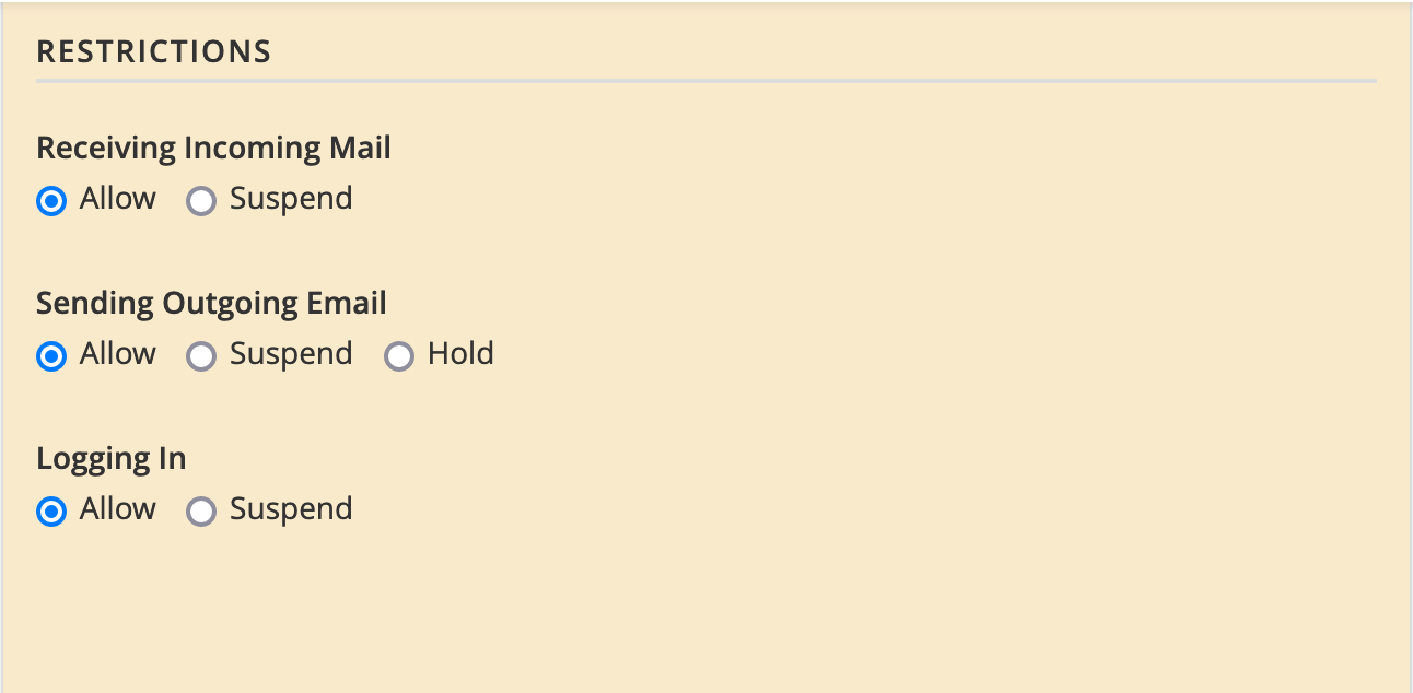 If you restrict receiving incoming mail, the sender will receive a bounce message. If you suspend outgoing mail, the user will receive a failure message. If you select hold, the messages will instead be kept in the server's outgoing mail queue. If you select allow after placing a hold, the messages will be released. Suspending login will deny logging in from anywhere that email is configured. Please keep in mind that this may trigger IP address blocking on the server.