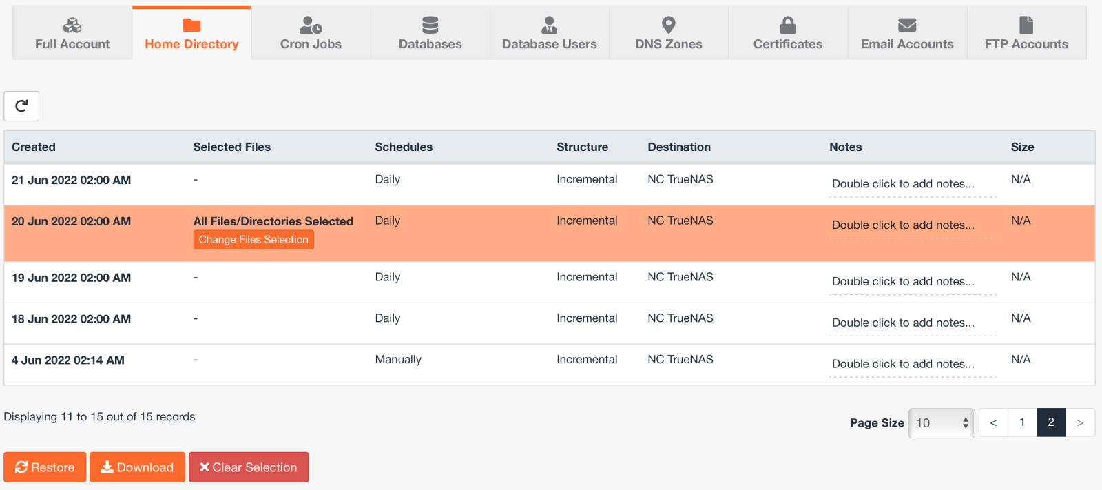 To restore a single file, click on home directory. Then click on a backup date to select it. Note: you will see the dates for which we have a daily backup of your account. A backup schedule marked as "manually" is one that you made. NodeSpace only retains the last 14 days of backups. We cannot restore files beyond 14 days.