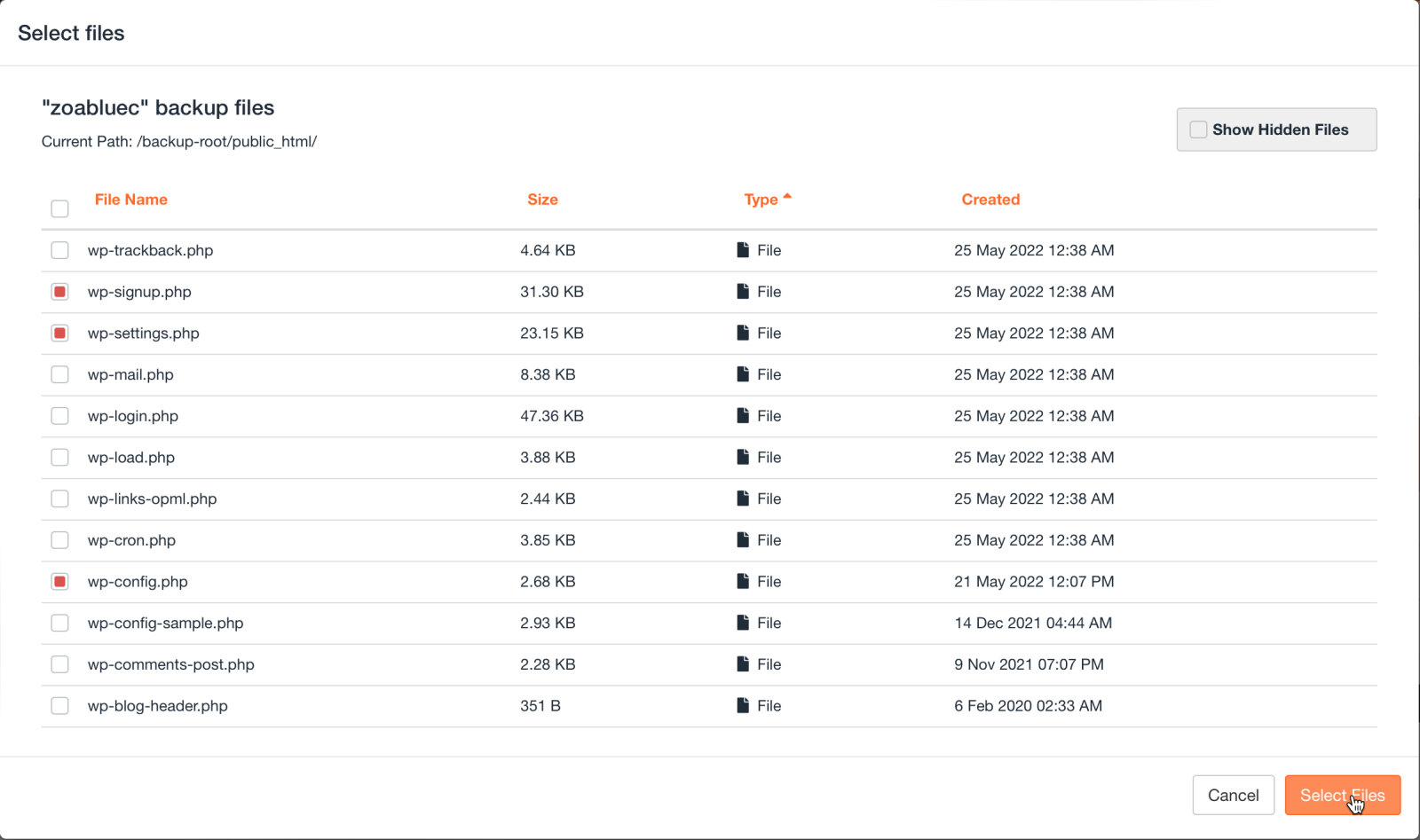 Click on the name of a folder to open it, click the box next to the folder to restore the entire folder. Click the box next to files to select files for restore. When you have selected the files you want to restore, click on select files. Then click on Restore. You will need to confirm your restore operation. Select Merge backup data with live account data if you don't want to overwrite or replace any files already in your account. For example, if you're restoring a folder that already exists but the data may have changed (for example, the WordPress uploads folder), you would want to select this so you don't lose any data that has already been added.
