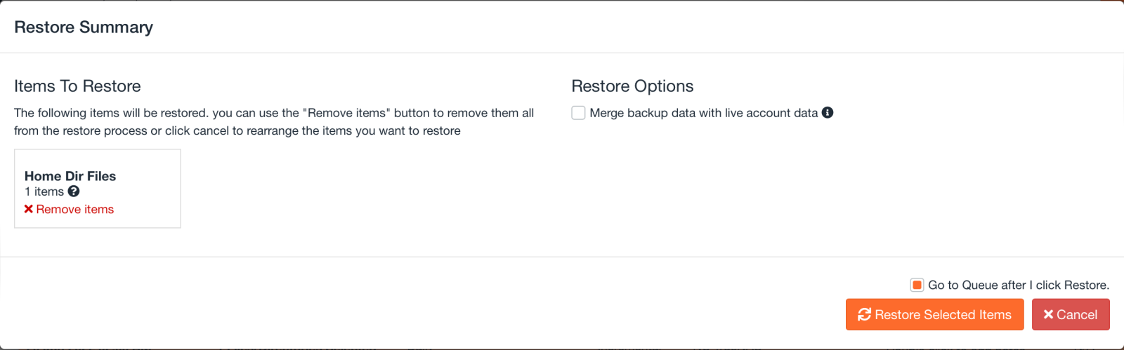 Click on restore selected items and your request will be placed in queue. It can take 1-5 minutes for the restore process to happen.