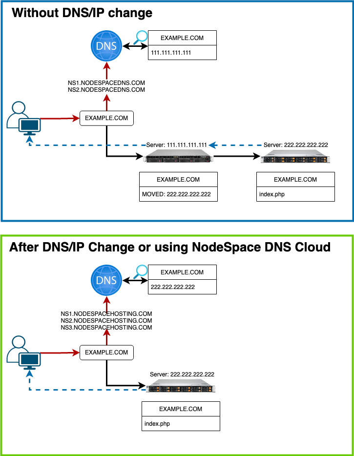 In order to give customers the best possible hosting experience, we will migrate customers on legacy servers to new hosting servers with new features, functionality, and are typically much faster than the previous server you were on. When you are migrated from one server to another within NodeSpace, we typically perform a zero-downtime migration. This means that very little downtime will be experienced when your site is moved. However, there is a lot of behind-the-scenes happening that makes this happen. Once your account is moved, you need to take certain actions to avoid interruption in your hosting. Zero-downtime migrations will require you to either update your name servers (if you're being migrated to a server that enables our DNS Cloud functionality for you) or update the IP address in your DNS records if you do not use our DNS Cloud service (e.g. Cloudflare, etc.). The reason why you need to do this is because the old server that your account was on is still responding to requests for your website and is sending those requests to the server now hosting your site. When we take down the old server, requests to your website will stop. Another reason is performance as the old server is relaying your site through itself, so your website may appear to run slower. When you change your name servers or IP to the new servers or IP, requests will start going directly to the new server. Please note: Once you are migrated to a server that uses NodeSpace DNS Cloud and you use our DNS Cloud-enabled name servers, any future server migrations will be completely seamless as our systems will update everything automatically.