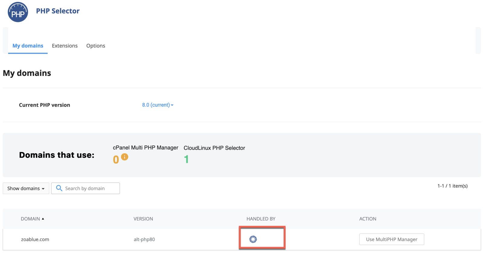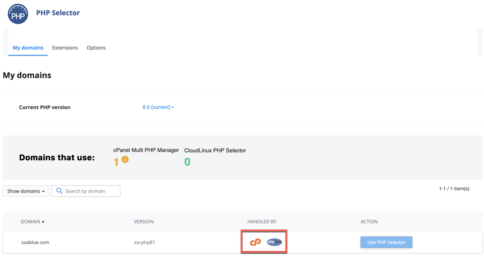 Login to cPanel and scroll down to the Software section. Click on Select PHP Version. Under My Domains, you will see all domains and subdomains in your account listed. In the Handled By column, you will see which platform is handling PHP for that domain or subdomain. In most cases, you will probably see a cPanel logo and a PHP-FPM logo. If you see this, then you will need to use MultiPHP to manage PHP.