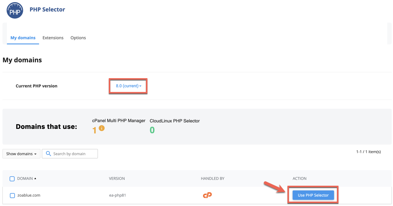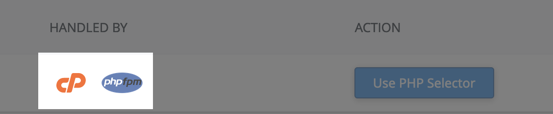 Unable to switch to PHP SelectorIf you are unable to switch to PHP Selector, it's probably because PHP-FPM is enabled for your domain. To check, see what logos are shown in the Handled By column. If you see both cPanel and PHP-FPM, please open a ticket and request PHP-FPM to be disabled on your domain.