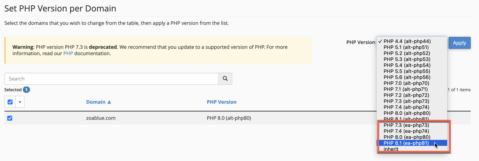 If you want to switch back to MultiPHP, go to MultiPHP Manager and tick the box next to the domain or subdomain. From the PHP version drop down menu, select the desired EA version of PHP and then click Apply.
