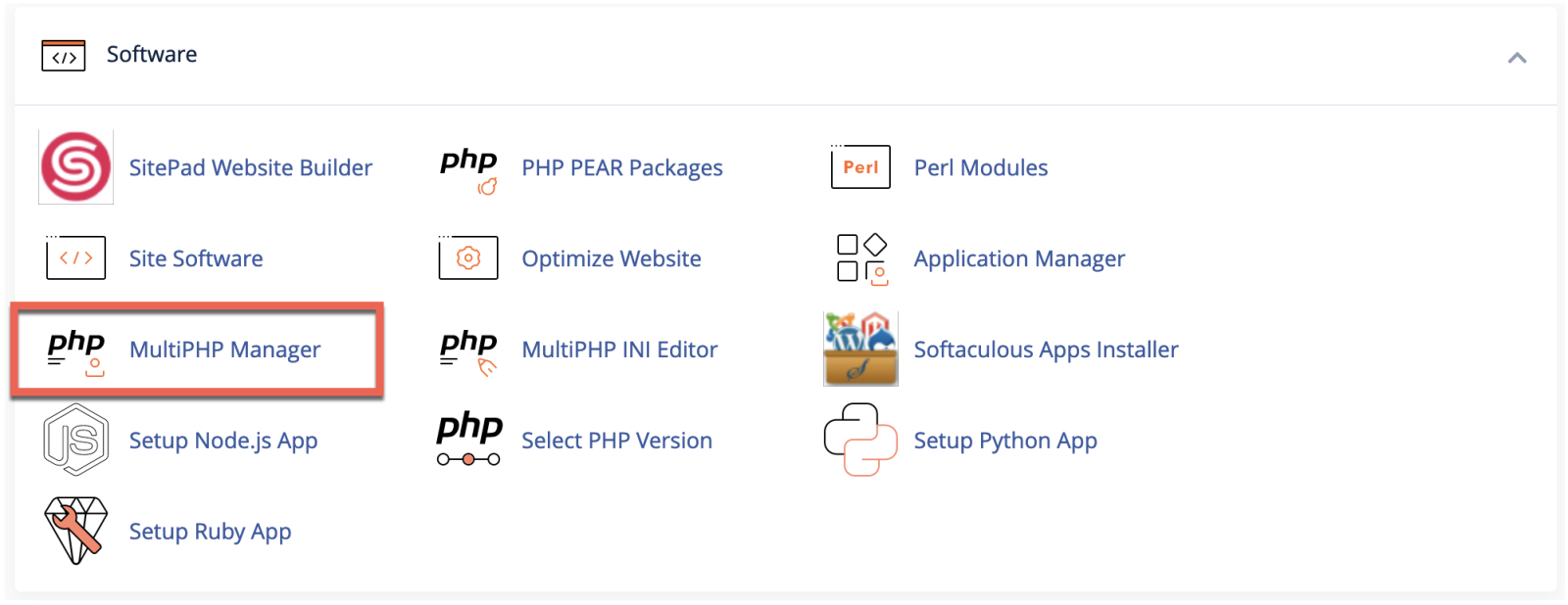 If this is the case, go back to the main cPanel tools page and go to the Software section. Click on MultiPHP Manager.