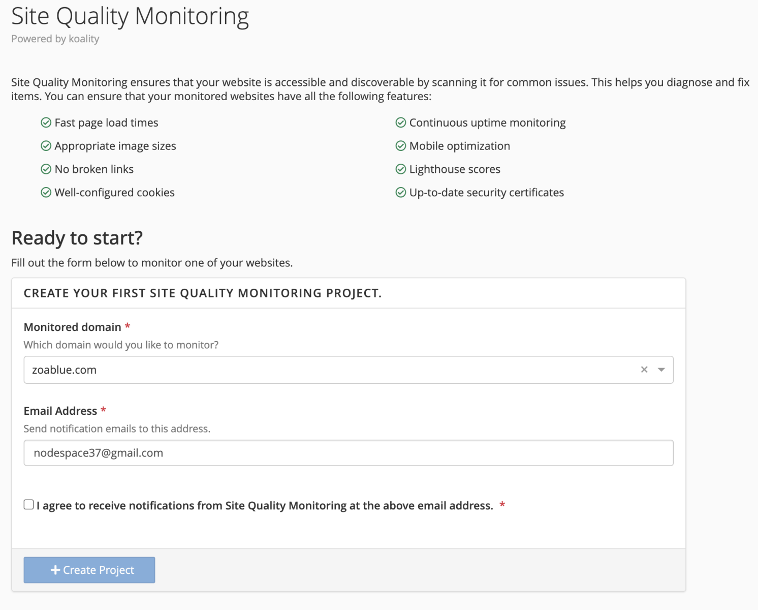 Keep in mind that this is an external service so NodeSpace will be sharing the email with the external service. Click on Create Project to continue. Creating the project will take a few minutes. You'll then need to obtain a security code from your email address provided.